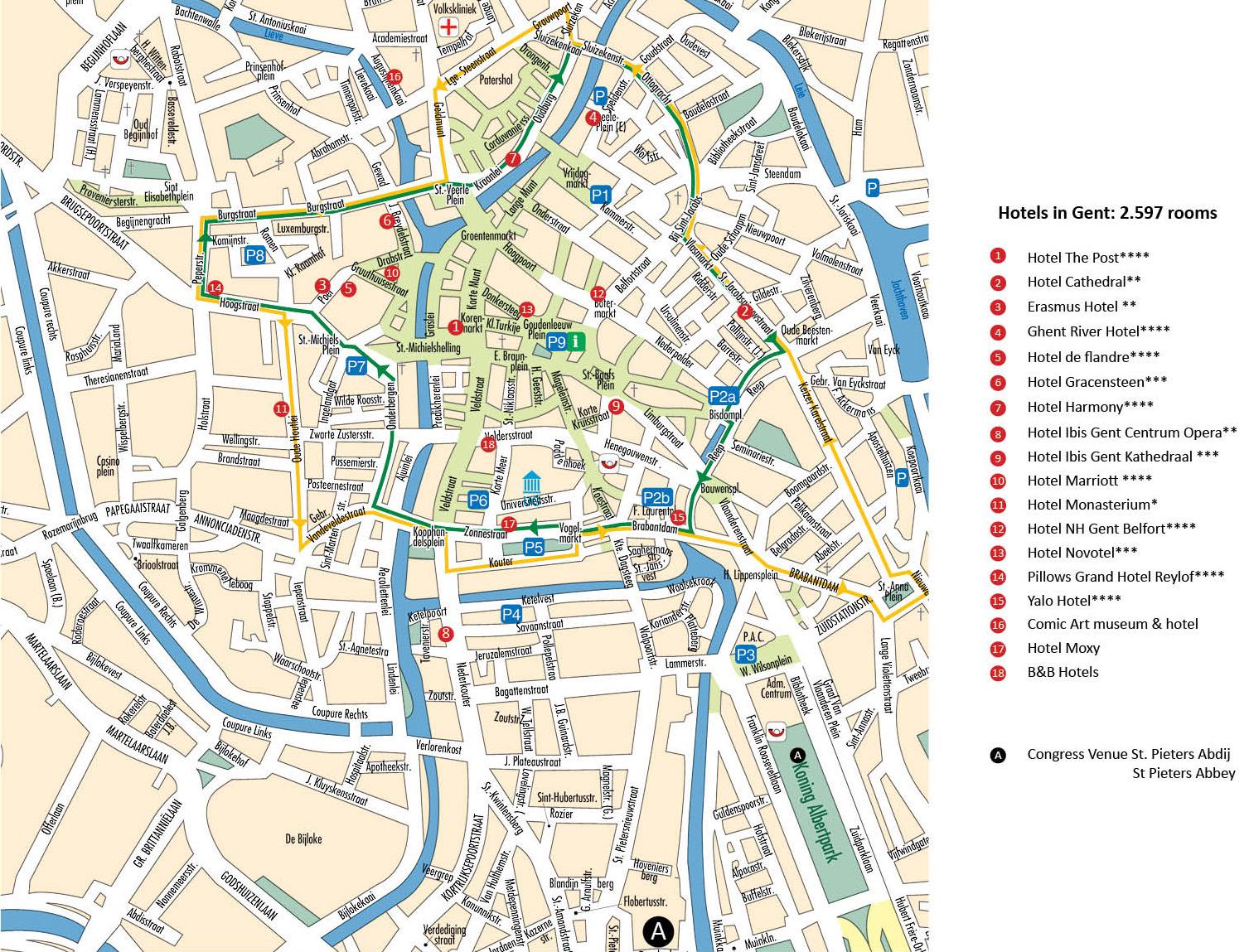 The city of Ghent has more than 2,000 Hotel rooms to offer. The local organsing committee can not, for obvious reasons , be involved in the booking process for your hotel room(s). However we have listed below the hotels that are situated in walking distance of the congress venue of the EELF Conference 2025. Because no hotel rooms are blocked for EELF at this time and because the available rooms will have to be shared with tourists and delegates of other congresses, we strongly advise you to book your hotel accommodation as soon as possible